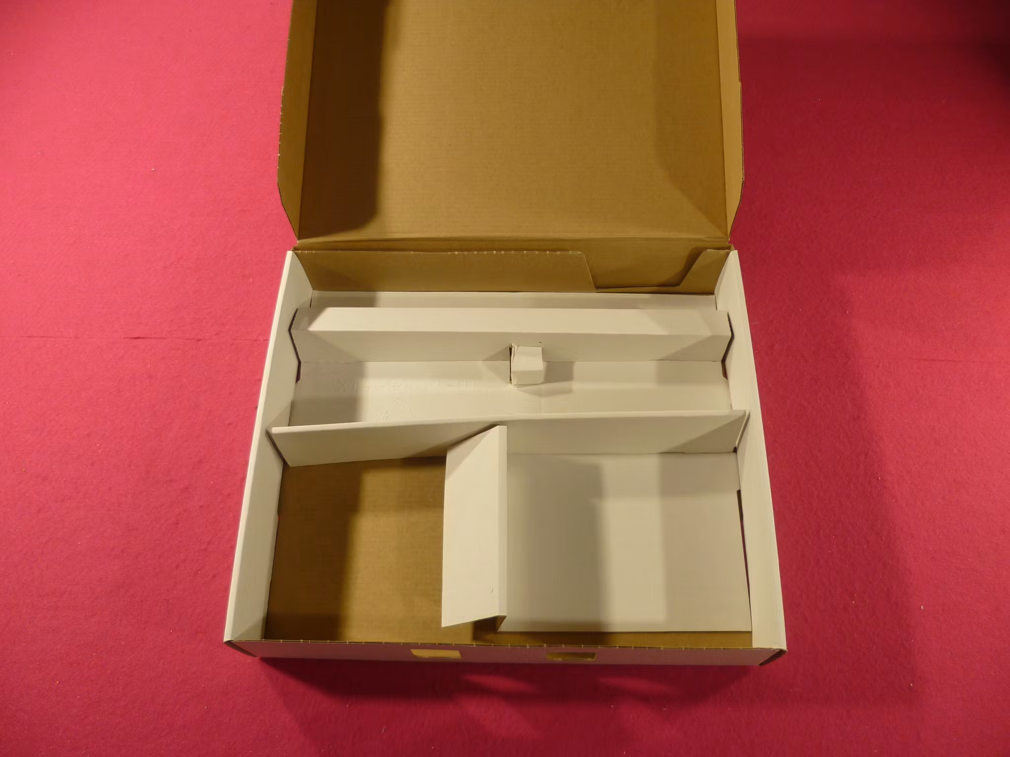 Box med innerkartong och inlägg för konsol samt instruktionsböcker.