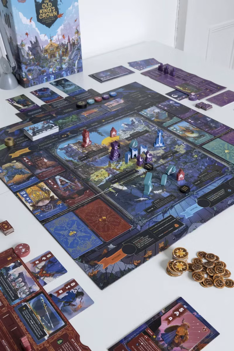 In The Old King's Crown, players move their Herald to locations, hoping to claim them. Then simultaneously players play cards from their hand, facedown to regions of the board. These are then revealed and resolved. Winning these clashes will result in different rewards that further their position and grant them the game's primary goal, influence. The player with the most influence by the end of a set number of rounds will be declared the winner.